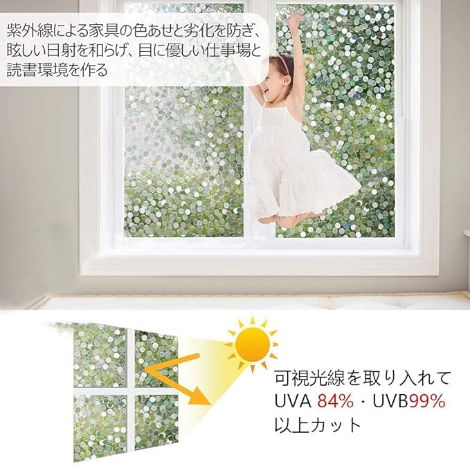 目隠し・日射調整・UVカット:明るさを保ちつつ、カーテンとさらば!20cm以上離れていれば、室内が見えにくく!天気や昼夜を問わず、いい目隠し効果があります。また、UVA 84%・UVB99% 以上カットし、日光を和らげ、内装を保護します。