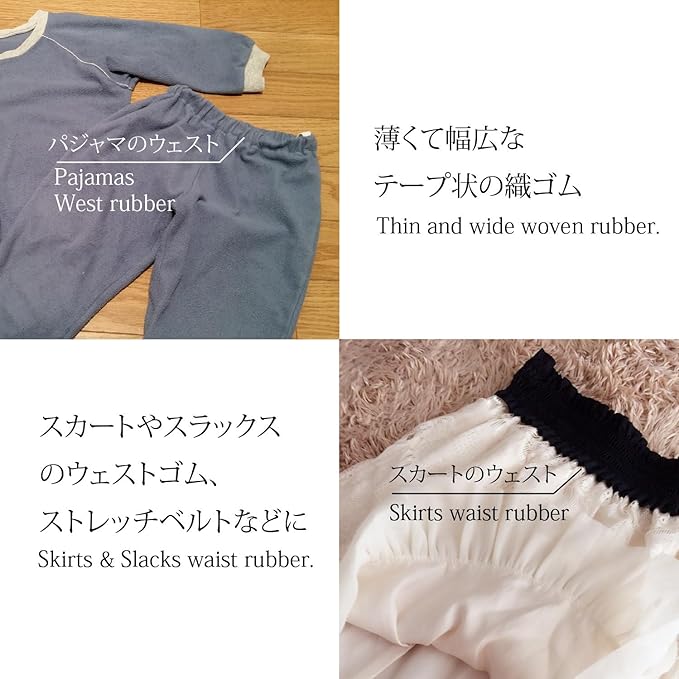 薄くて幅広なテープ状の織ゴムです。衣類のウエストやストレッチベルトに最適です。 日本製 材質:天然ゴム レーヨン糸 伸び率:250% 5m巻