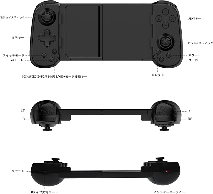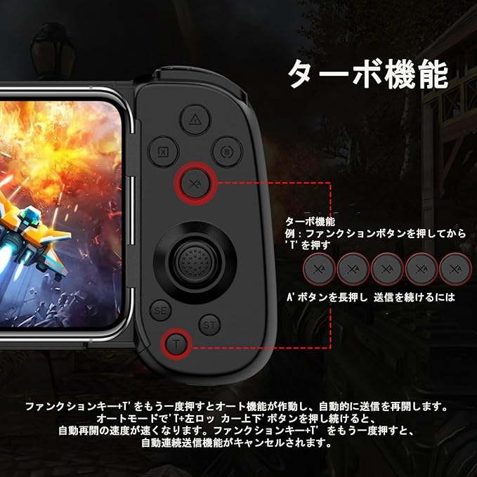 【3段階ターボ機能】iphone ゲームパッドはターボブースト機能を搭載し、ゲームによって、マニュアルモード、オートモード、キャンセルモードの3つのターボブーストモードを調整できます。A/ B/ X/ Y/ LT/LB/RT/RB/ 十字キーをターボブースト機能に設定でき、シューティングゲームや格闘ゲームで勝ちやすくなります。