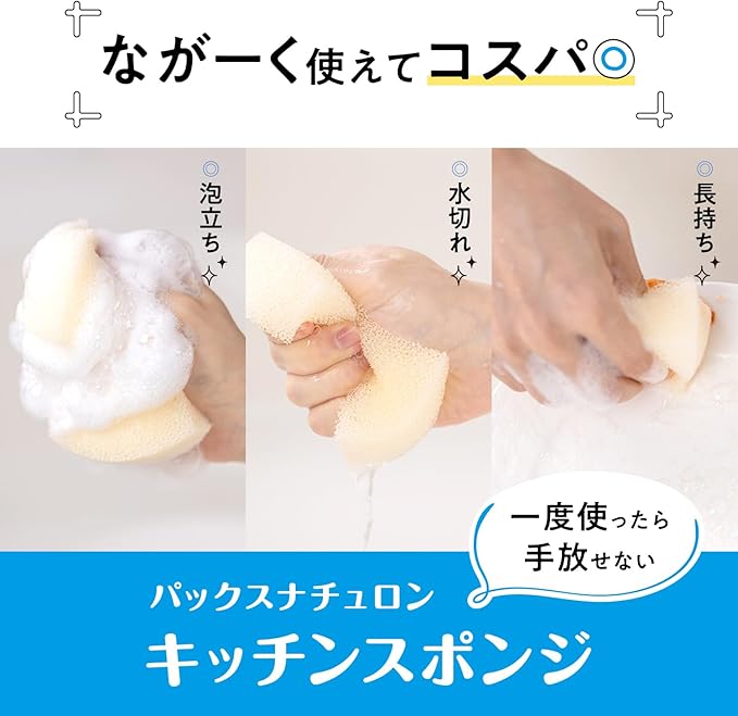 ✅【泡立ち、水切れの良い台所用スポンジ】骨格構造の目の粗いキッチンスポンジ。泡立ち・水切れが良く衛生的で、研摩剤などを使用していないので食器を傷つけません。耐久性に優れているので長く使えて経済的です。