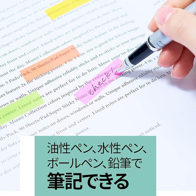 ・じょうぶで破れにくい、フィルム素材のポストイット製品。・貼ると透明になり、下の文字や絵などを隠しません。・1枚ずつ取り出せるポップアップ式です。・本や書類で、ページの細かい分類や数多くの見出しが必要な時に色数が多く、色分けに便利。・フィルム素材なので長期間でもキレイに保管できる。また、はがしたい時にキレイにはがせる。くり返し貼ったりはがしたりでき、破れにくい。