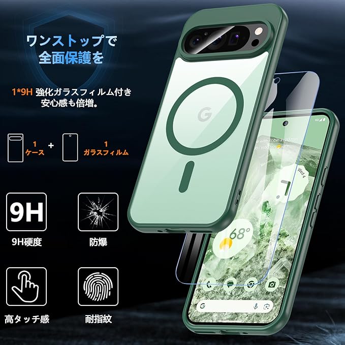 【対応機種&パッケージの内容】Google Pixel 9/Google Pixel 9 Pro 6.3インチ対応専用ケースです。(Pixel9、Pixel9 Proは両機種とも使用でき、Pixel9 Pro XLは非対応です。)ガラスフィルム付き、MagSafe対応、ストラップホール付き、耐衝撃性、黄ばみ防止のスマホケース、便利で美しく、誰でもどんなシーンにも適しています。対応機種を間違いないようにご購入お願い申し上げます。パッケージの内容:ケース*1 ガラスフィルム*1 セットのインストールパッケージ*1