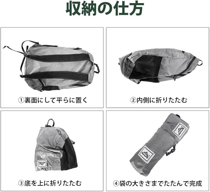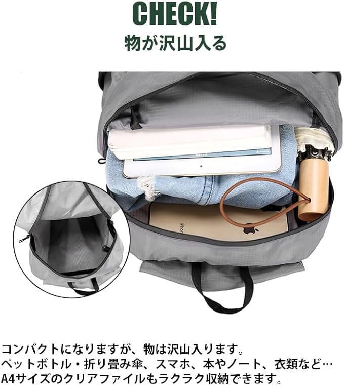 コンパクト収納で持ち運びに便利 シンプルで実用的なパッカブル リュック コンパクトで便利なパッカブル リュックです 撥水加工で急な雨でも安心 シンプルなデザインで男女ともにお使いいただけます 手のひらサイズまでコンパクトで軽量・収納袋付き 手のひらサイズまで小さくなり、約85gと軽量で持ち歩きにも便利です また、収納袋もついているので、綺麗に収納でき、使用しない時も邪魔になりません 調節可能なショルダーストラップ 調整可能なバックル付きなので性別問わず使用できます また、ショルダーストラップがメッシュになっているので、蒸れずに快適に掛けられます 物が沢山入る コンパクトになり、リュック自体の外見は大きすぎず、でも物は沢山入ります ペットボトル・折り畳み傘、スマホ、本やノート、衣類など A4サイズのクリアファイルもラクラク収納できます 深めの外側ポケット・サイドメッシュポケット 外側のファスナー付きポケットは深さがあり、大きめのスマートフォンもラクラク入ります また、ジッパーがシリコンコーテイングされているので、雨がジッパーの隙間から浸透しにくい設計です サイドメッシュポケットは500mlまでのペットボトルや折りたたみ傘も収納出来ます 撥水加工で急な雨にも 撥水加工されていますので、急な雨でも安心です 様々なシーンで活躍 通勤・通学はもちろん、旅行(トラベル)・出張など、様々なシーンで活躍 キャンプ・アウトドア・釣りなどで色々な小物を収納するのにも適しています 豊富なカラーバリエーション A.ブラック B.ネイビー C.ライトグリーン D.ピンク E.ライトブルー F.オレンジ G.グレー H.ブルー もっとお買い得を目指しました グローバル販売向けの商品を直輸入安価にご提供が可能になりました 厳重な商品検品、ラベルや商品パッケージ製作など 日本国内販売向けの製造はとてもコストUPに繋がります それらを省いて大幅なコストダウンを実現しました サイズ(約): 本体サイズ:高さ41cm 幅24cm 奥行12cm(約) 収納サイズ:高さ14cm 幅7cm 厚さ4cm(約) 容量:20L(約) メインポケット・外側ポケット 1・サイドポケット 2 重量:85g(約) 素材:ポリエステル 生産国:中国 実寸につき誤差がある場合がございます 傷、汚れなどが有る場合がございますアウトドアに使うものになりますのでご理解の上、ご注文お願いします 画像はサンプル(試作)の為、実際の色や仕様と異なる場合がございます