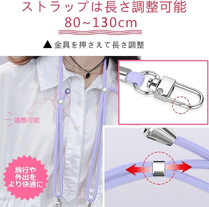 【使いやすさ・長さ調整可能】柔らかいナイロンストラップで首を快適に保ち、金属製のアジャスタブルエンドで、快適な長さに調整できます、手を自由に、ストラップの全長は1.3メートルです。ストラップを取り外して、電話ケースを単独で使用できます。