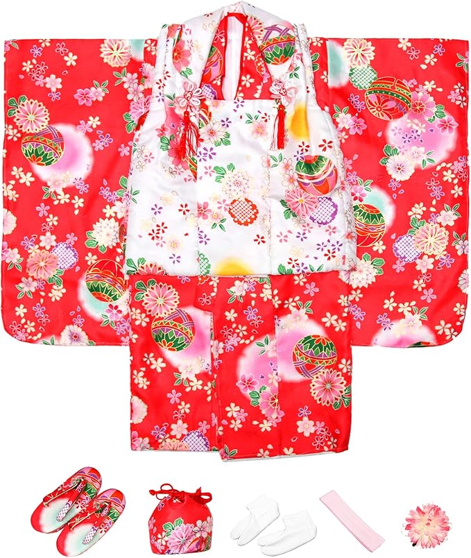 [セット内容]:被布/着物/伊達衿/長襦袢/髪飾り/巾着/草履/腰紐/足袋/専用化粧箱
