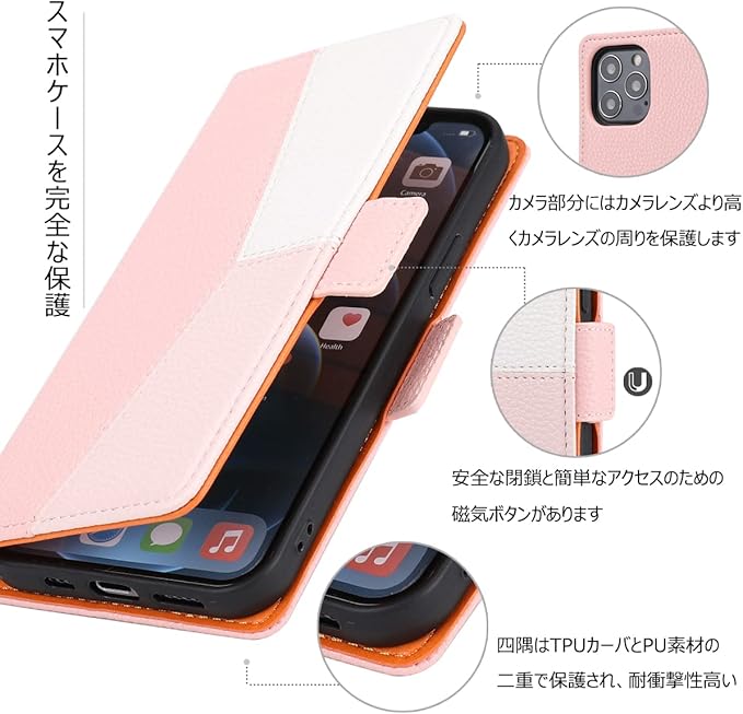 【全面保護】耐熱性と柔軟性を誇るPUから作られていて、滑りにくく、指紋、油分などもつきにくく、手帳型ならではの全面保護機能でディスプレイはもちろん、背面もしっかりガードします。傷やほこりを防ぐことができるスマホケースで、衝撃吸収機能あり、しっかりの二重保護でお携帯を守り抜きます。
