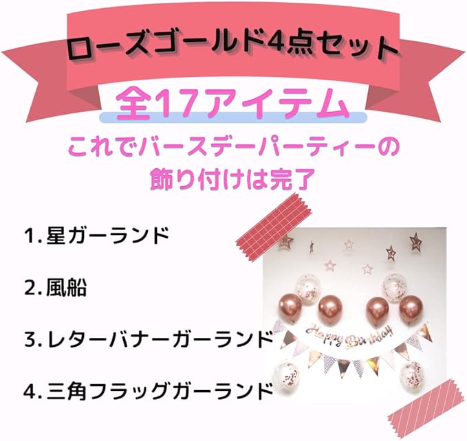 【豪華な17点セット】バースデーパーティーはこちらのセットにお任せ!立体的に飾ることでどなたでも華やかなパーティが演出できます。 セット内容は大小の星ガーランド 7,メタルカラーバルーン 4,コンフェッティバルーン 4,レターバナーガーランド 1,三角フラッグガーランド 1
