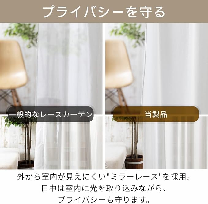 【紫外線からお肌・家具を守る】外から室内が見えにくい「ミラーレース」を採用。日中は室内に光を取り込みながら、UVカット&プライバシーも守る。