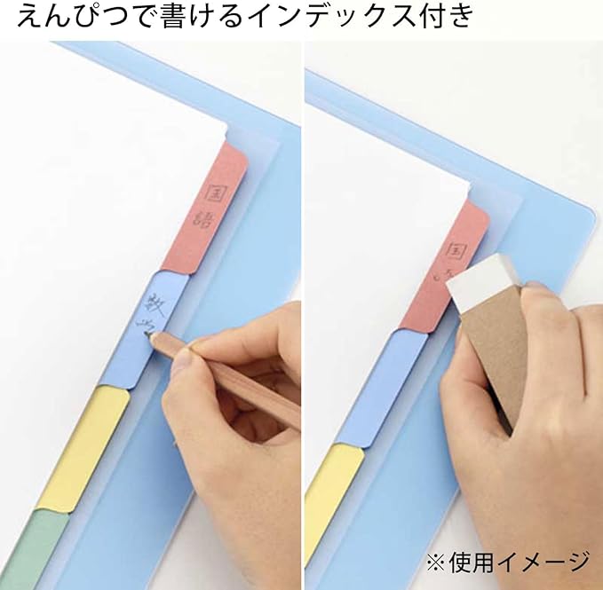 ●付属品/6mm横罫ルーズリーフ5枚、6mm復習罫ルーズリーフ5枚、えんぴつで書けるインデックス大5山+小5山(※インデックスは、数回書いて消すことができます。※筆圧によってかける回数は異なります。)、クリアポケット1枚