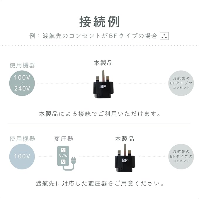 ・海外の電圧に対応していない電気製品を海外で使用する場合は、別売の海外旅行用変圧器と併用してお使い下さい。