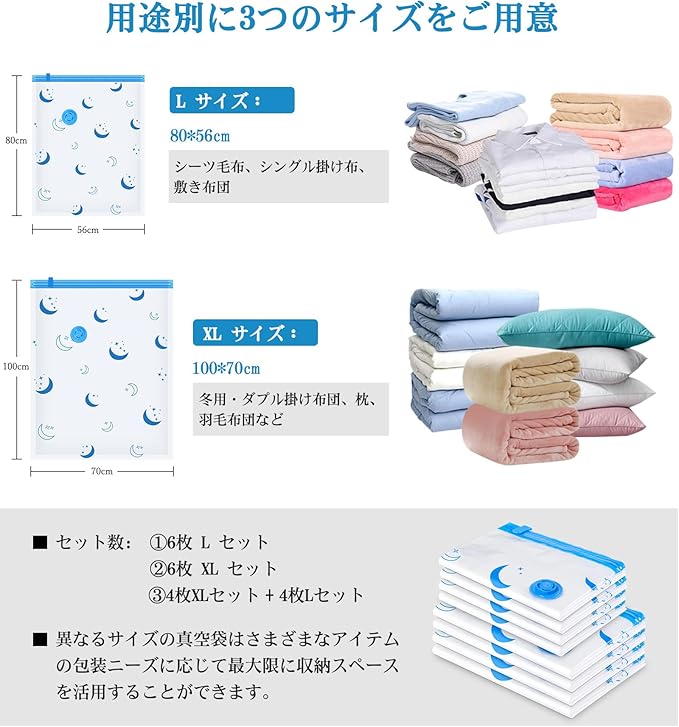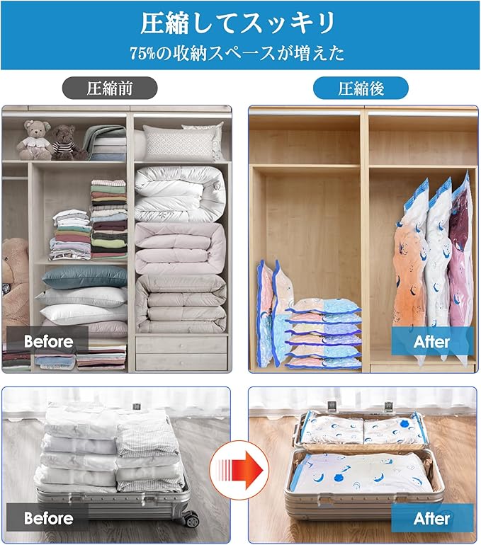 【最大限のスペース節約!75%の空間効率化】8枚圧縮袋(100 70cm 4枚 80 56cm 4枚)、衣類、ダウンジャケット、布団、枕、シーツ、寝袋、ブランケットなどの収納すすめ!これにより、75%もの空間を節約できるため、クローゼットや押入れの中でも効率的にスペースを活用することができます。掛け布団や毛布をコンパクトに保管し、整理整頓された環境を実現しましょう!