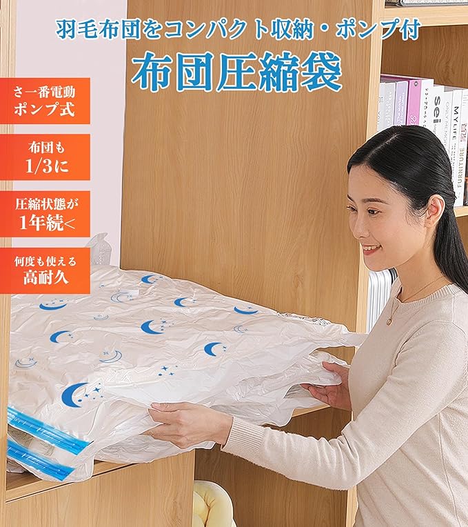 【電動ポンプ付き】当社の布団圧縮袋には便利な電動ポンプが付属しており、手動ポンプと比べて効率的かつ迅速な空気抜きが可能です。力を使わずに、コンセントに差し込んでバルブに取り付け、スイッチをオンにするだけで、数秒で完了します。