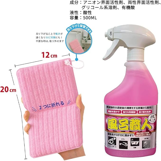 風呂職人 500ml バススポンジ セット 頑固な お風呂 汚れ 水垢 除去 掃除 クリーナー 洗浄剤 日本製 (ピンク)