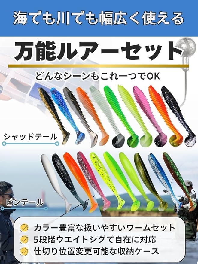 【商品仕様】〇セット内容:ワーム50個(5.5cm、10色アソート)、ジグヘッド50個(1g、1.8g、2.5g、3.5g、5g 各10個)、収納ケース1個。〇バリエーション→①シャッドテールAタイプ : ワームカラー(ホワイト、ブラック、オレンジ、ピンク、イエロー、グリーン、夜光、ドジョウ、ブルー、ロブスター)、②シャッドテールBタイプ : ワームカラー(ブラック、オレンジ、ピンク、イエロー、グリーン、夜光、オレンジホワイト、グレーホワイト、ブルー、ブラックゴールド)、③ピンテール: ワームカラー(ホワイト、ブラック、オレンジ、ピンクホワイト、イエロー、グリーンイエロー、夜光、ドジョウ、ブルーホワイト、ロブスター)。〇素材 : ワーム(PVC)、ジグヘッド(鉛・タングステン鋼)。※ケースに入っているワーム、ジグヘッドの箇所は多少異なるケースがあります。※サイズにつきましてはあくまで目安のため若干の誤差が生じる場合がありますのでご了承下さい。※商品写真はできる限り実物と近づけるようにしていますが、お使いのモニター設定、お部屋の照明等により実際の商品と色味が異なる場合があります。※海外製品のため日本製のものと比べて細かいところで雑に見えるものや多少の誤差がある場合があります。恐れ入りますが予めご了承ください。