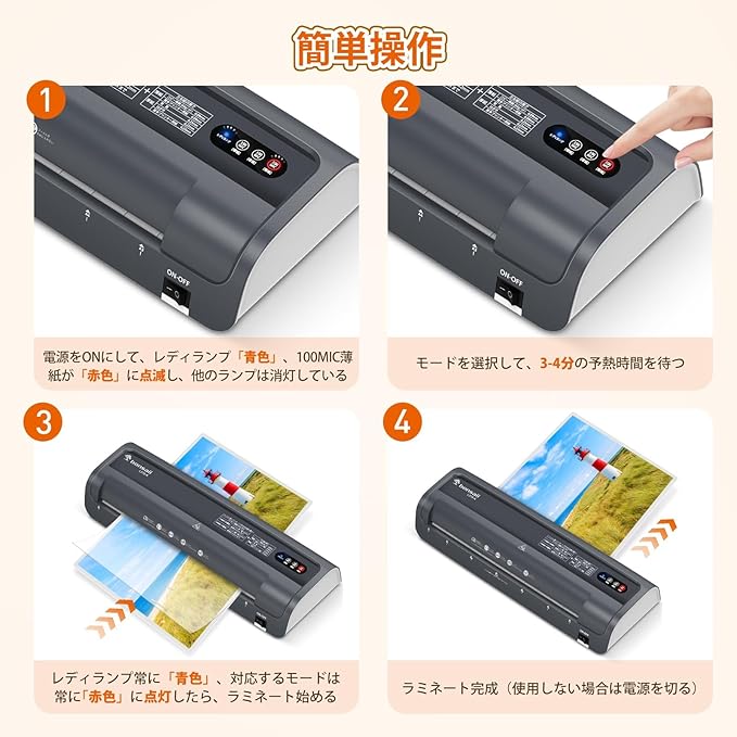 【ABS機能付き】万が一、原稿を間違えてしたり詰まったりしても、「ラミネート停止ボタン」を押せばすぐに取り出せ、故障する可能性を大幅に減らします。商品にご満足いただけない場合は、いつでも「お問い合わせ窓」にお気軽にご連絡ください。※お買い上げ日より一年保証