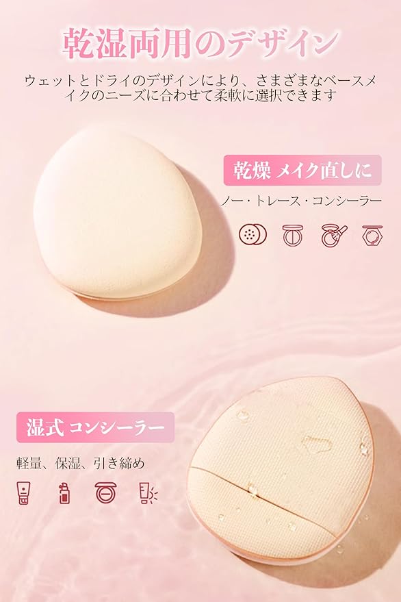 ①スポンジを湿らせ、なめらかな下地を作ります。 ②乾いた状態でファンデーションの仕上げやチーク、ハイライトのぼかしに使用します。 ③ぬるま湯と洗顔料で軽く洗い、清潔さを保ちます。