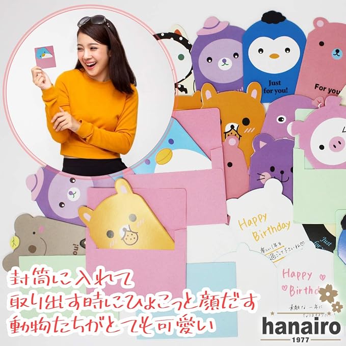 使用シーン:「お誕生日おめでとう」「Happy Birthday」「ありがとう」の気持ちをメッセージカードで♪ 「照れくさい言葉」や「直接言えない言葉」はメッセージカードに込めてみてください!手書きの文字で相手の心に伝えたい方、可愛い動物たちがサポートします♪