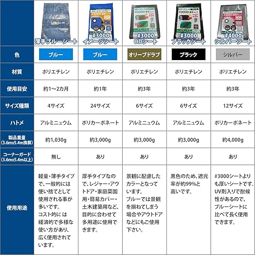[仕様]#3000厚手、材質:ポリエチレン(本体)、ポリカーボネート(ハトメ)、ハトメ数20ヵ所、ハトメ間隔約90㎝。