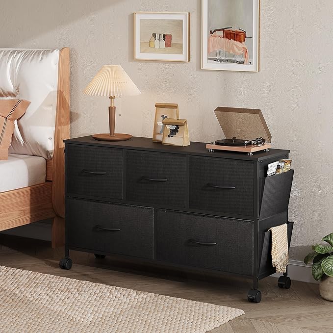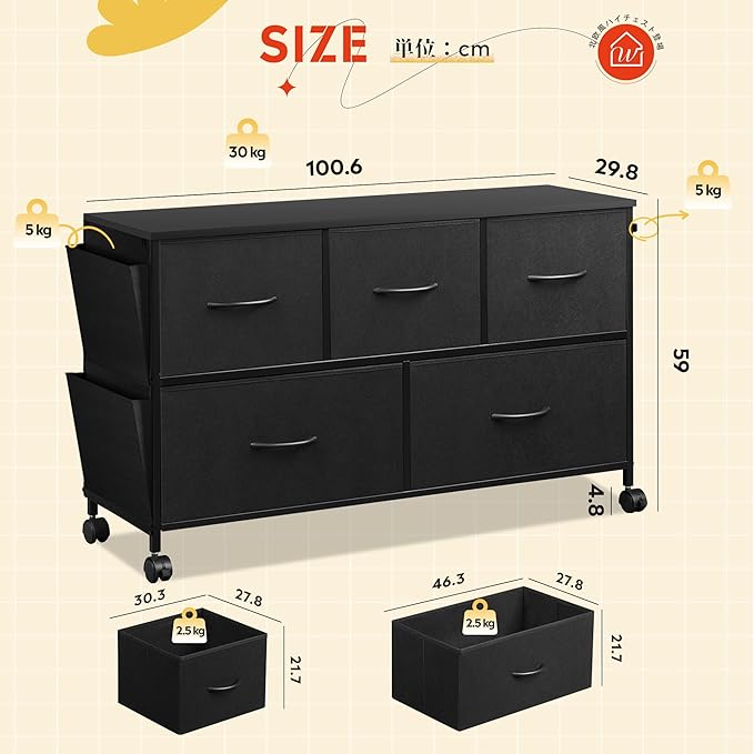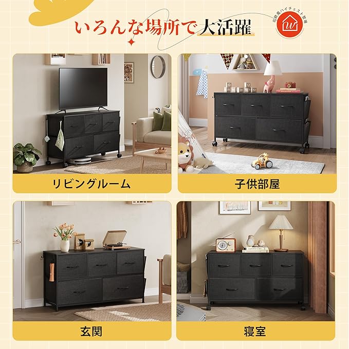 WLIVE チェスト タンス キャスター付き サイドポケット付き 2段5杯 箪笥 ローチェスト リビング収納 おしゃれ 収納チェスト 布製 引き出し 大容量 洋服タンス 衣類収納 北欧 シンプル ブラック ASNG607