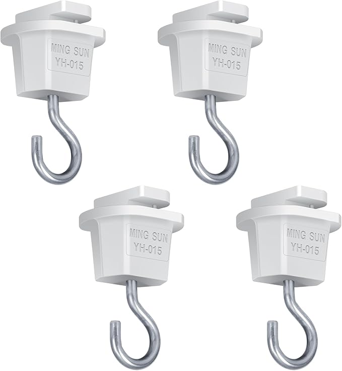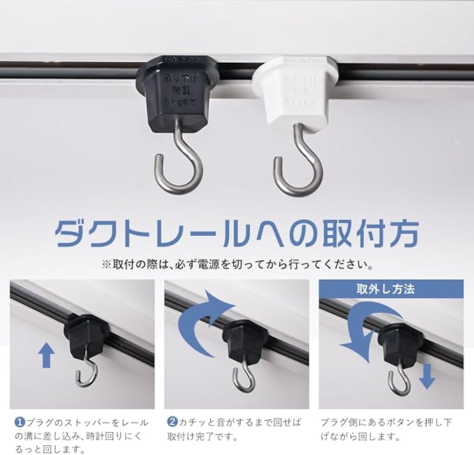 【工事不要・簡単取付け】:天井取付レール用のフックです。レールにはめ込んで回すだけで固定できます!金具はプラスチックのベースに完全に固定されており、回転しないので非常に安定しています。手軽に取り付けることも出来るので、初心者でも女性でも便利です!