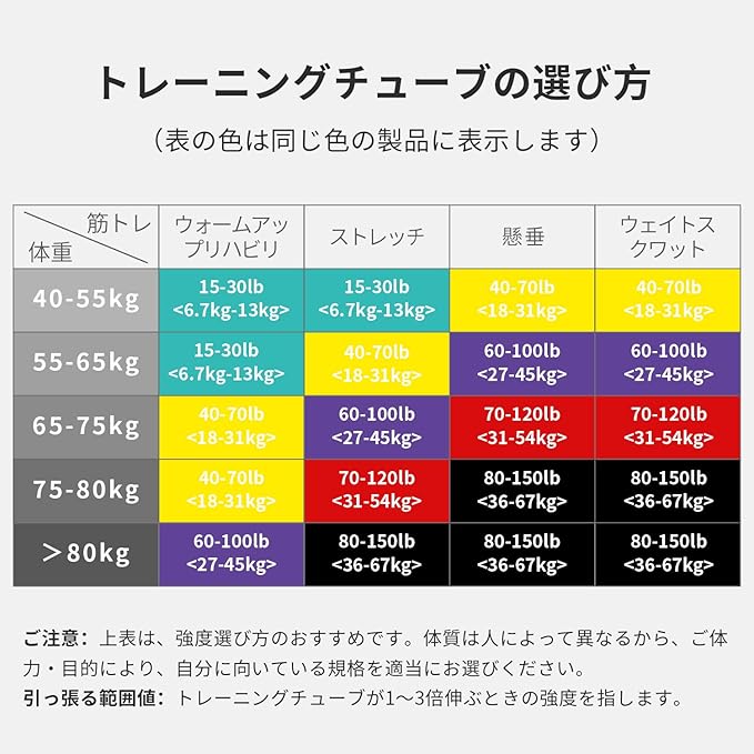 【5種類の強度】グリーン(6.7~13kg)、 イエロー (18~31kg)、 パープル (27~45kg)、 レッド (31~54kg)、 ブラック (36~67kg)の5種類。トレーニングに合わせて強度を選べる