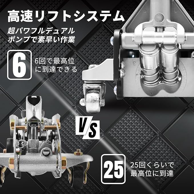 【デュアル油圧システム】2つの油圧ポンプを搭載した独自システムにより、少ないハンドル操作で素早く車体を持ち上げられます。ローダウン車からSUVまで、幅広い車種に対応したパワフルな性能を発揮します。油圧式の特性を活かし、スムーズで安定したジャッキアップが可能です。