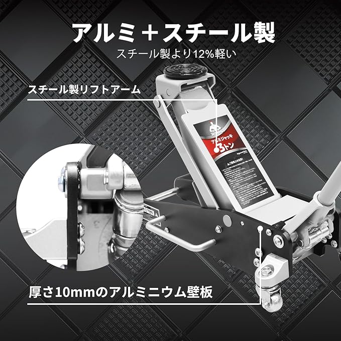 【軽量ハイブリッド】アルミニウムとスチールの複合材を使用した独自のハイブリッド構造を採用。従来のスチール製ジャッキに比べて約30%軽量化を実現しながら、十分な強度を確保しています。ガレージ内での持ち運びや収納が格段に楽になります。サビに強い材質を使用しているため、長期間使用しても耐久性が持続します。