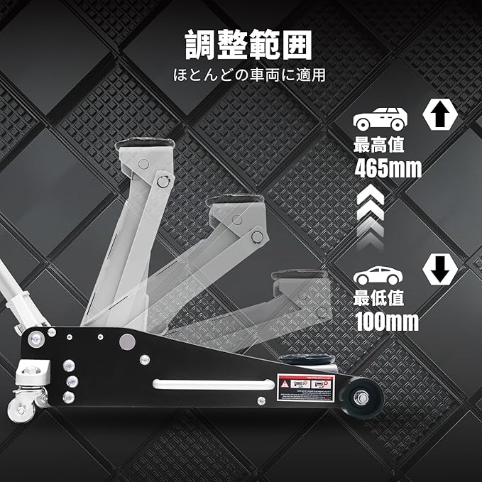 Jack Boss アルミジャッキ ガレージ 油圧フロアジャッキ 3t 自動車用 タイヤ交換 アップ用 最低位100mm/最高位465mm ローダウン車対応 スチール デュアルポンプ 低床 軽量 高耐久 ブラック