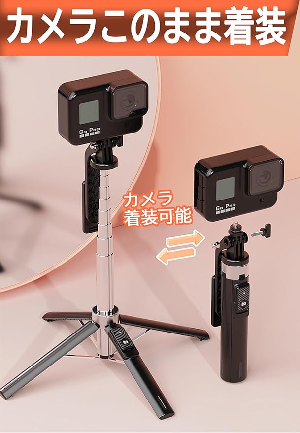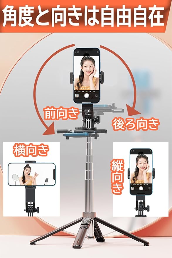【三脚一脚両用】安定感抜群の三脚がついていて、セルカ棒としてはもちろん、三脚としてもご利用いただけます。 運動会、パレード、イベントなど人が混む場面でも楽々!三脚と一脚を自由変換、撮影、映画放送、TikTok、スマホスタンド、卓上スタンドとしてもOKです。ビデオ通話、生放送、Web会議などにも最適です。