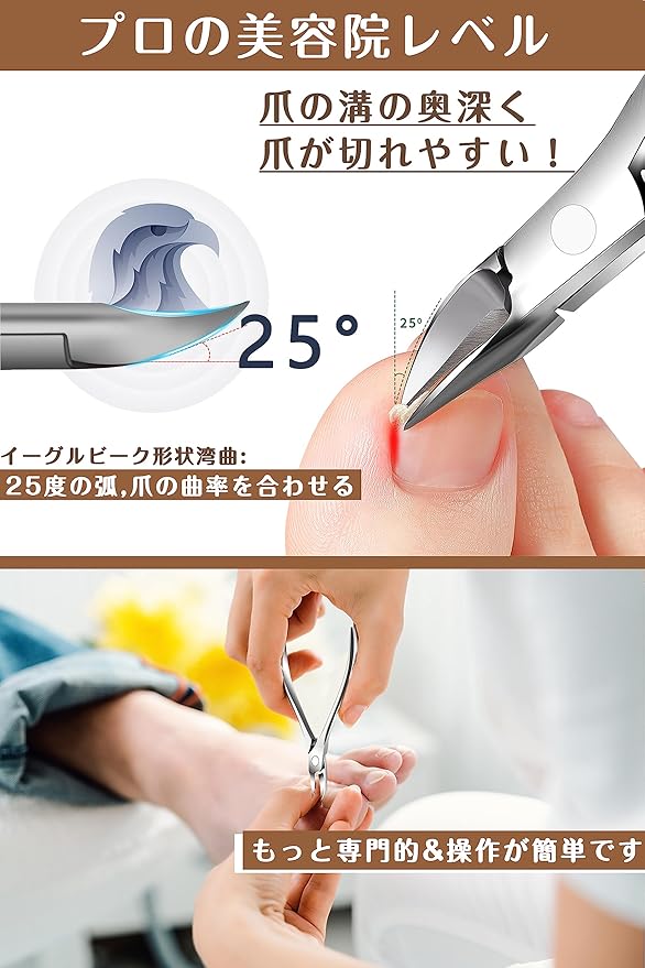 【足の巻き爪を家庭で処理&足の専門爪切り】①足の指の爪のクリッパーのアップグレードは——25 の湾曲した刃先は湾曲した爪に合うように設計されており、鋭い先端は厚い爪/陥入爪/変形爪を簡単に手入れすることができます。中高年の方にもお使いいただけますので、爪切りを探すのに悩むことはありません。②巻き爪や厚い爪用に設計されており、湾曲したブレードは、爪を切るときのけがを防ぎ、爪の問題によって引き起こされる痛みを和らげます。