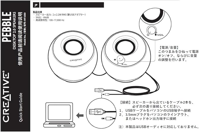 【ケーブル】ケーブルはボリュームつまみのあるスピーカー(右チャンネル)に固定されています。左右のスピーカーは最大設置幅が約1m、3.5mmケーブル/USBケーブルも約1.2mほどです。【スピーカーサイズ】各サテライト スピーカー 約122 116 115 mm *** お願い ***ご利用上のトラブルや不具合がございましたら、まずクリエイティブメディア㈱のサポートセンターまでお問い合わせください。その際にご使用中のパソコン情報等いただければ、より詳しくご案内をすることが可能になります。