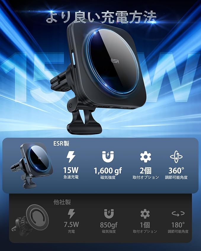 ESR スマホホルダー 車 ワイヤレス充電 マグネット 高速充電 15W magsafe 車載ホルダー magsafe充電器 磁気吸着 多角度自由調節 エアコンルーバー/ダッシュボード式車載ホルダー 車 スマホスタンド iPhone Air 17 Pro Max 16e 16 15 14 13 12、Samsung S25対応 ブラック