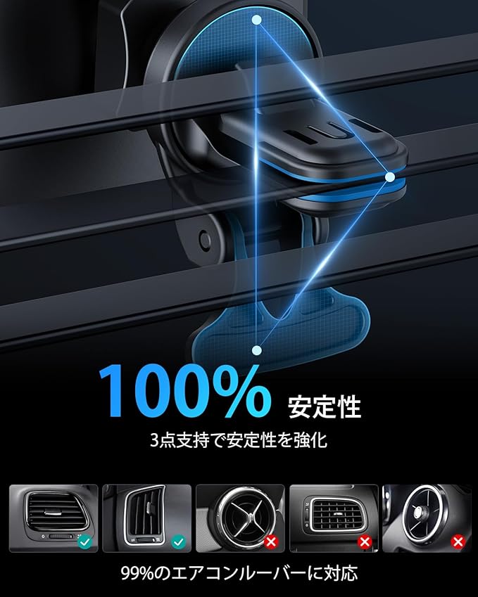 【安定したベント式固定】強力なベントクリップと固定アームにより、取り付けの安定性が向上。