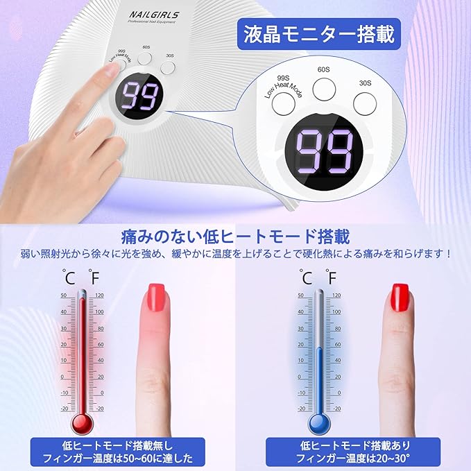 【低ヒートモード機能が付き】 99sの無痛モード搭載して、温度を徐々に上げて、ジェル硬化途中による痛みを抑えることができます。紫外線や痛みに敏感する方はこの99s低ヒート無痛モードをご利用オススメです!ストレスなくジェルネイルが楽しめます!