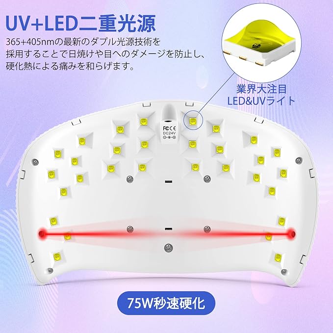 【365〜405nmの照射波長で全ジェル対応】 ジェル ネイルライトは365〜405nmのUVとLED二重光源なのでほとんどすべてのジェルの硬化範囲に対応しています。例:ベースコート、トップコート、カラージェル、ハードジェル、スカルプチャージェル、ジェムグルー、UV`レジンなど。