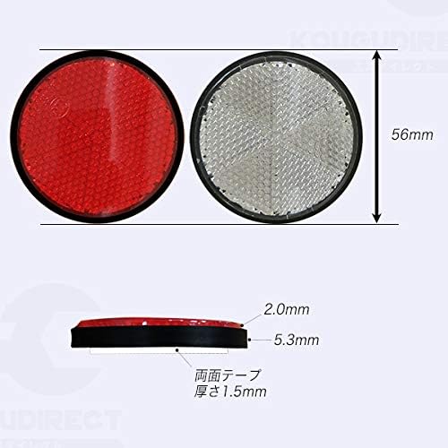 ※裏面の両面テープの大きさや貼り付け箇所に個体差があります。ご了承の上ご注文をご検討ください。■ 自転車用リフレクター円形 リフレクター反射板丸型 ■ カラー : 赤 / 白 / 緑 / 黄から選択して下さい。 ■ サイズ(赤白共通) : 直径 56mm 厚さ 7.8mm(両面テープ含まず) 重量 : 10g ■ 素材 : プラスチック ■ 自転車事故防止のための反射材(リフレクター)です。 ■ バイク、自動車、トラックの視認性工場にも。 ■ 両面テープによる取り付けなので、工具不要です。両面テープは本体裏面に最初から貼付されています。※湾曲部分への接着はできません。 ■ 視認性・反射率の高い素材で、遠くから見ても確認できるため、昼夜ともに高い安全性を確保できます。 ■ 梱包は簡易なものになります。