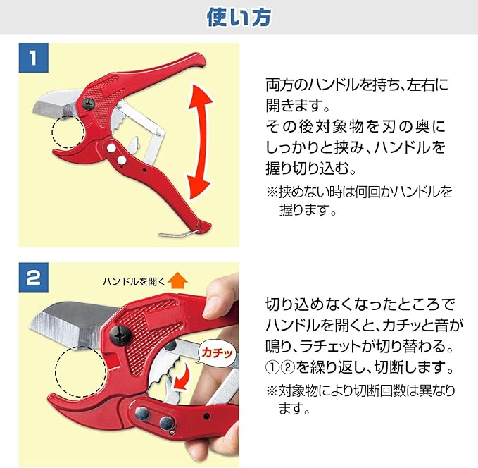 ラチェット式なので、一人でも簡単に軽い力で切断することができます。