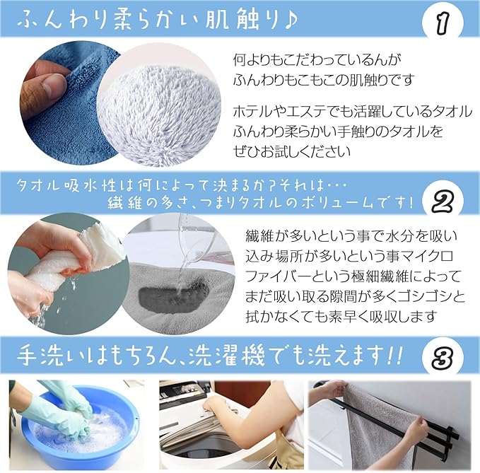 【カラフルなタオルであなたの生活を彩ります】 ホワイトかブルー、からの暗めのグレー、色の配色的には涼しい色合いを選び、丁寧に染めあがりました。レギュラーサイズと軽量化のデザインから家庭用はもちろん、出張や旅行にもピッタリです。お風呂上り、ジム、美容院、プールなどいろんなシーンでは大活躍します。