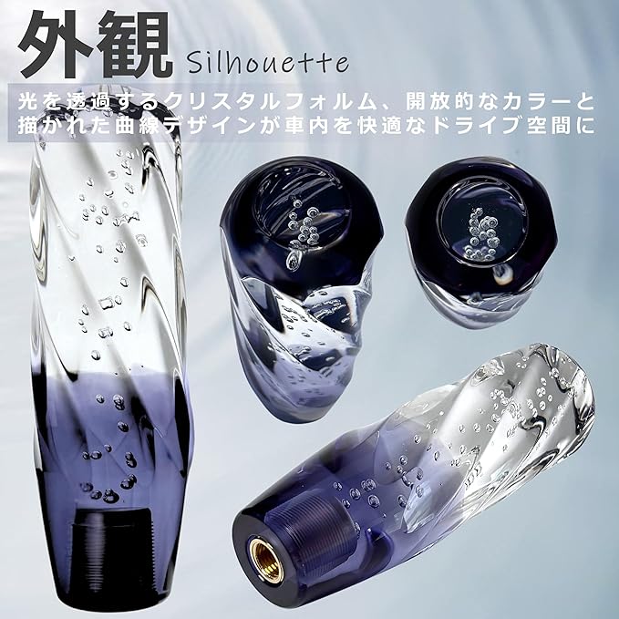 流れるような曲線フォルムと透明度の高いアクリル素材のスティック型・汎用・ツイストクリスタルシフトノブです。綺麗でクリアなボディとバブルに透過する光が車内を心地良い空間に!