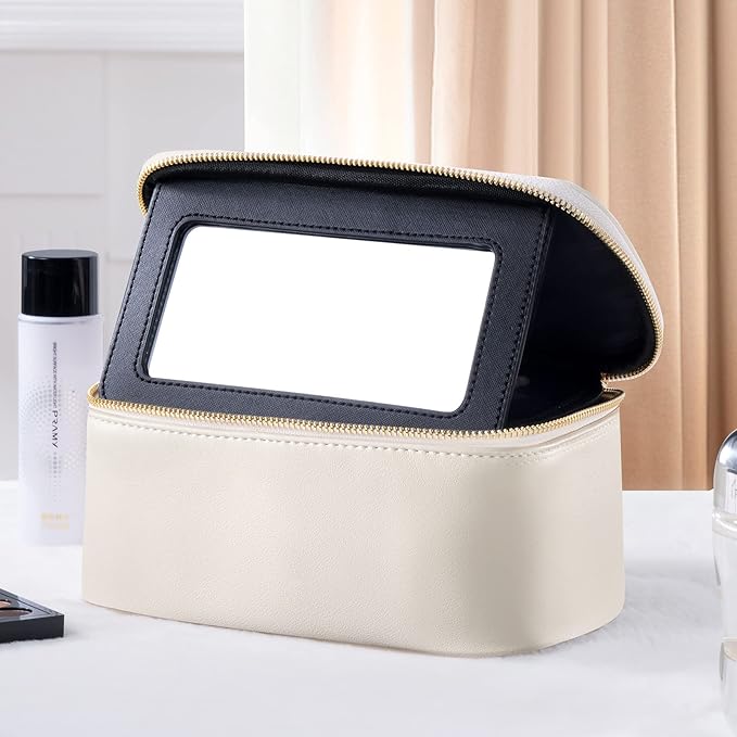 Rownyeon コスメボックス 鏡付き メイクポーチ 大容量 持ち運び 仕切り 化粧ポーチ メイクボックス 小物入れ 韓国 バニティポーチ 限定商品 ブラシポケット付き トラベル 防水 軽量 かわいい おしゃれ 化粧道具 (ホワイト)