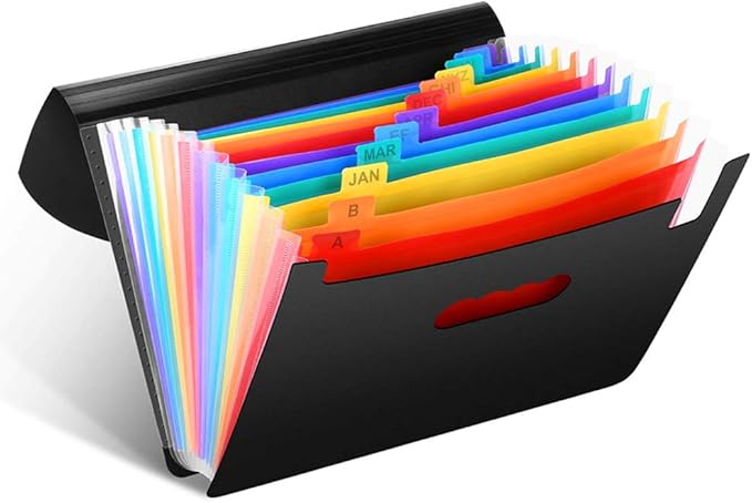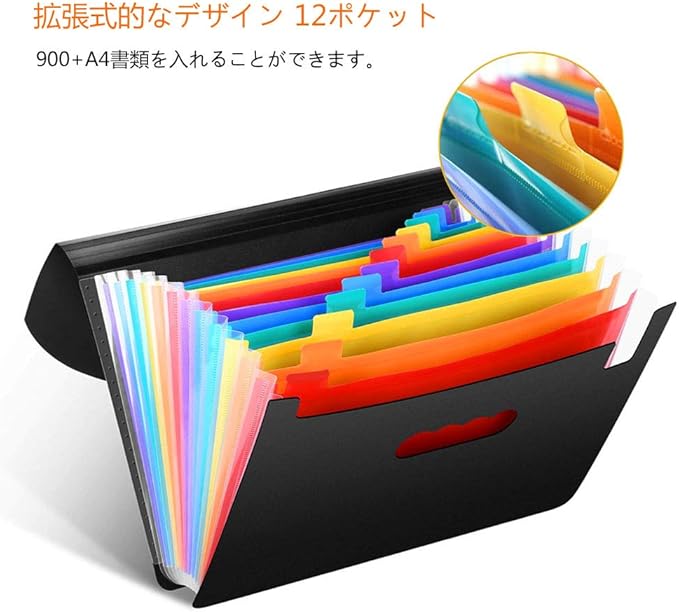 ファイルボックス 書類収納ケース 拡張フォルダ ドキュメントスタンド CNASA A4 12分類 大容量 マルチカラーラ 蓋付き ラベル付き ブラック 教室オフィス家庭旅行
