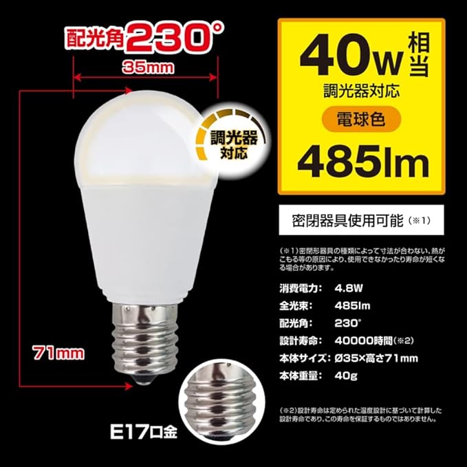 【調光器対応】全光束:485lm(小形電球40W相当)/消費電力:4.8W
