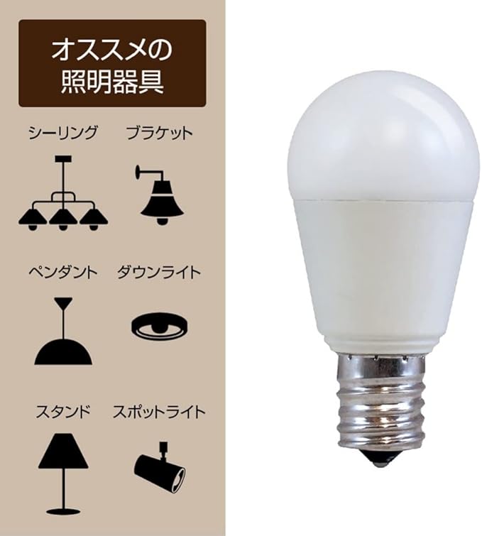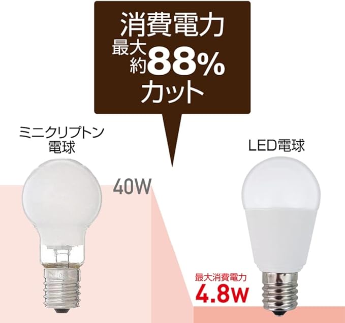 調光機能のついた照明器具に使用可能。ミニクリプトン電球より低消費電力。
