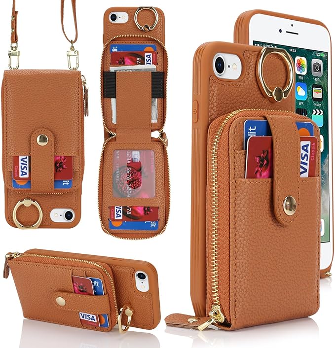 for iPhone SE 2022 / Se 2020 / 8 / 7 通用 ケース 肩がけ 長さ調整 首掛け 斜め掛け ファスナー ストラップ付き SunYoo ショルダー リング付き 手帳型 アイフォン スマホケース アイホン Case カバー ブラウン