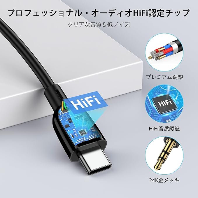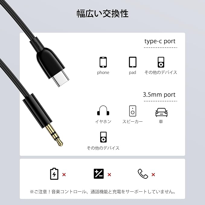 幅広い互換性:iPhone 16/15、iPad Air 6 2021、iPad Pro 2021/2020/2018、iPad Air 4、MacBook、Galaxy S23/S22/S21/S20/S10 Lite/Note20、P40/P30 Pro、OnePlus 8/9/10 Pro、Google Pixel 7/6/5/4 XLなど多数のType-Cデバイスに対応します。【ご注意】1.双方向ではなく、逆(3.5mmを出力、usb type-cで入力)での使用は不可能です。 2.音声伝送専用に対応したケーブルです。マイク/ヘッドホン制御対応できません。