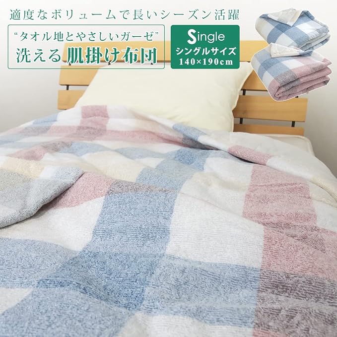 春から長い間使えて経済的な洗える肌掛け布団。中わた入りでタオルケットよりもふんわり、ほど良い厚みがあるのに軽いので、体に負担をかけずにお使い頂けます。