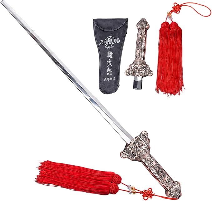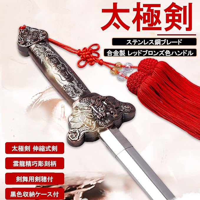 商品詳細: 太極剣セット(伸縮式太極剣・収納ケース・剣穂)【サイズ】 全長90cm(収縮時25cm) 【重量】 約465g 【材質】 ステンレス鋼・合金 ※剣舞を行う際は周囲の環境に充分留意していただき怪我の無いように行ってください。 ※モニターの環境等により、色の見え方に若干差が生じる場合がございます。予めご了承ください。