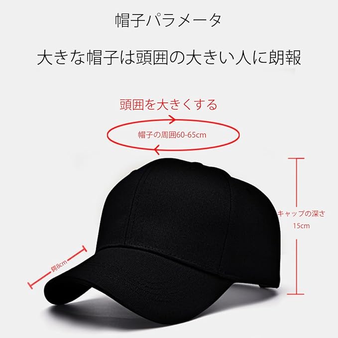 ②:頭の大きい方に向きご用意したキャップ メンズです。頭周りは60cm以上であり、調整可能なので、お好みのサイズ感に被ることができます。つばの長さ約8cm、深さ約18cm、日本人の頭がた型にフィットし、日除け効果が高いです。また、深めの設計になりますのでフェイスラインを隠すことで小顔効果もあります。