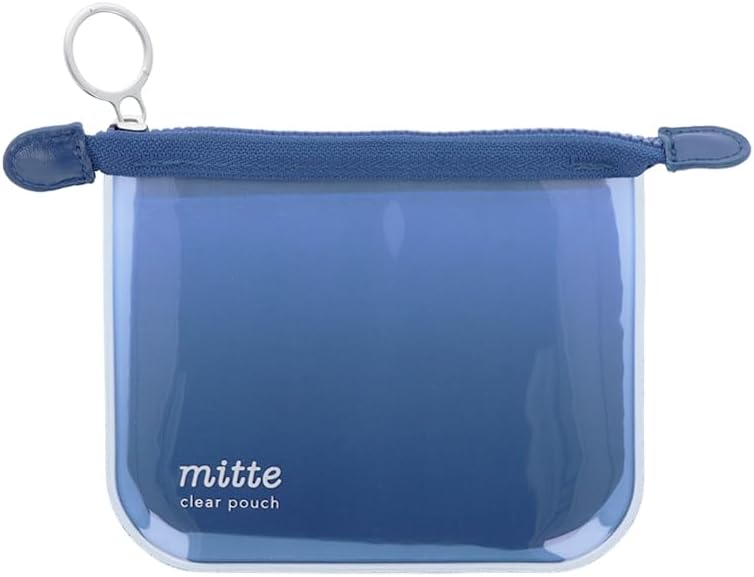 表面のロゴは箔押し+型押しデザインでスマートに収まるミニサイズでフラットタイプの、[クリアポーチミニ フラット mitte]。イメージは、midnight。