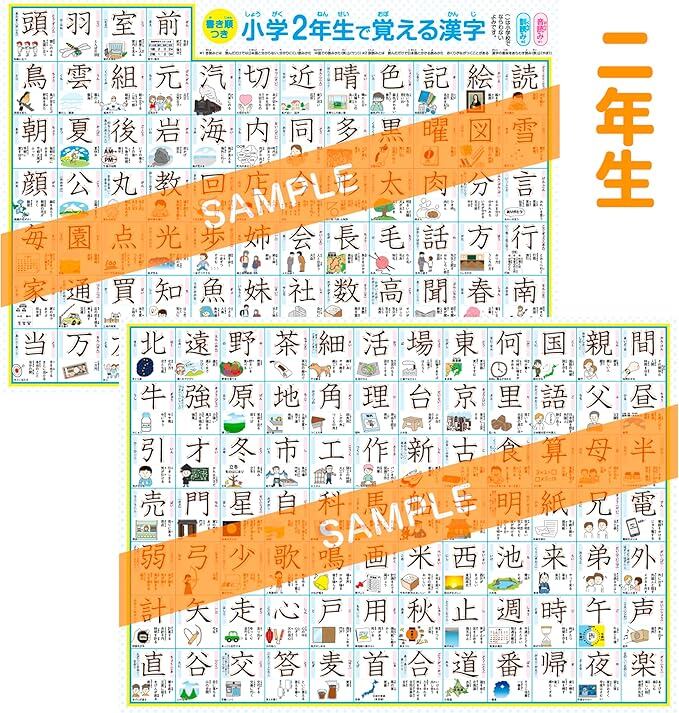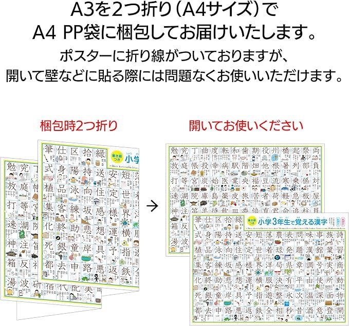 【完全防水】 小学一年生、小学ニ年生、小学三年生で習う漢字表 お風呂ポスター 1年生、2年生、3年生 A3ユポ紙(2つ折りのA4梱包) 2枚の計6枚セット 書き順・使用例・イラスト付き 防水